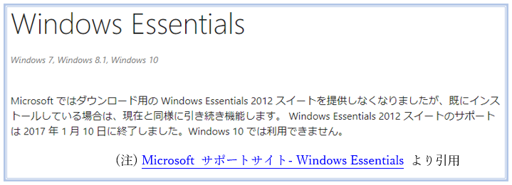 Windows Live メールは、GmailやYahoo!メールのようなオンラインメールを含めて複数の電子メールアカウントを一括管理できる便利なメールソフトだったため、サポート終了後も継続して使用されている方が多いようですが、メール受信が重複するようなバクが修正されないままだったり、修復不能な不具合が発生する可能性や、多くはメールを侵入口とするウイルスなどのセキュリティ攻撃への対応もされませんので、まだWindows Live メールをお使いの方は、早急に新しいメールソフトに移行されることをお勧めします。