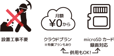 月額費用0円で、1日分の検知録画(動体を検知した10秒程度の映像)をクラウドに保存できます。万一カメラが破損してもクラウド上にデータがあるので安心、ダウンロードも可能。有償プランではクラウドに複数日間の連続録画が可能です。