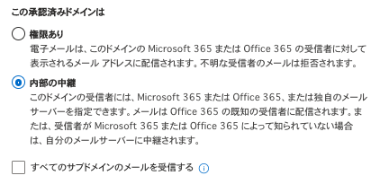 その場合、そのドメインを「承認済ドメイン」として登録し、さらに「内部の中継」を設定する必要があります。
