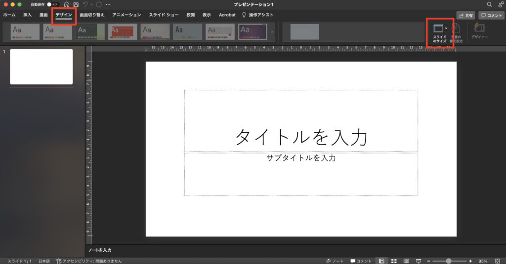 ツールバーの「デザイン」から「スライドのサイズ」をクリックします。