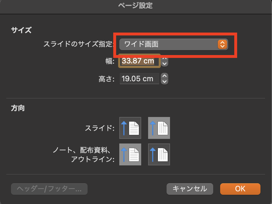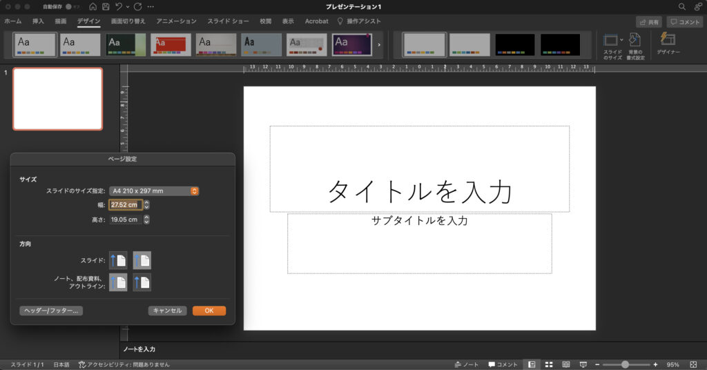 OKボタンをクリックするとスライドのサイズ設定ウィンドウが閉じて、その設定が即時反映されます。