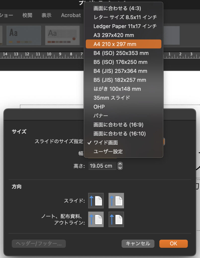 もう一度スライドのサイズ設定ウィンドウを見るとしっかりとA4設定になっています。