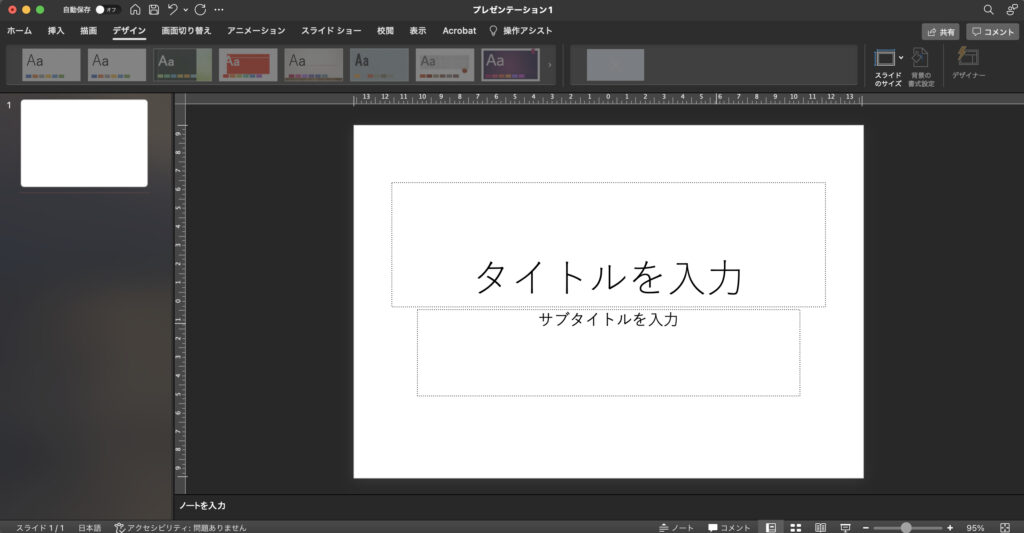 資料作成後にスライドのサイズを変えると掲載していたオブジェクトの配置が崩れることがあるので、何も記載していないまっさらなうちに変更しておくのがおすすめです!
