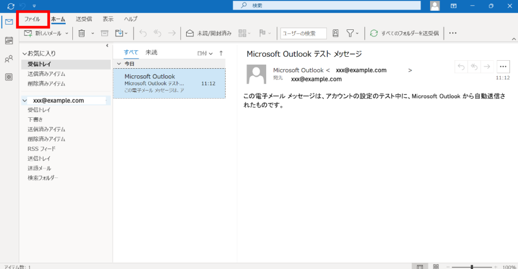 Outlook上部のタブメニューより[ファイル]をクリックします。