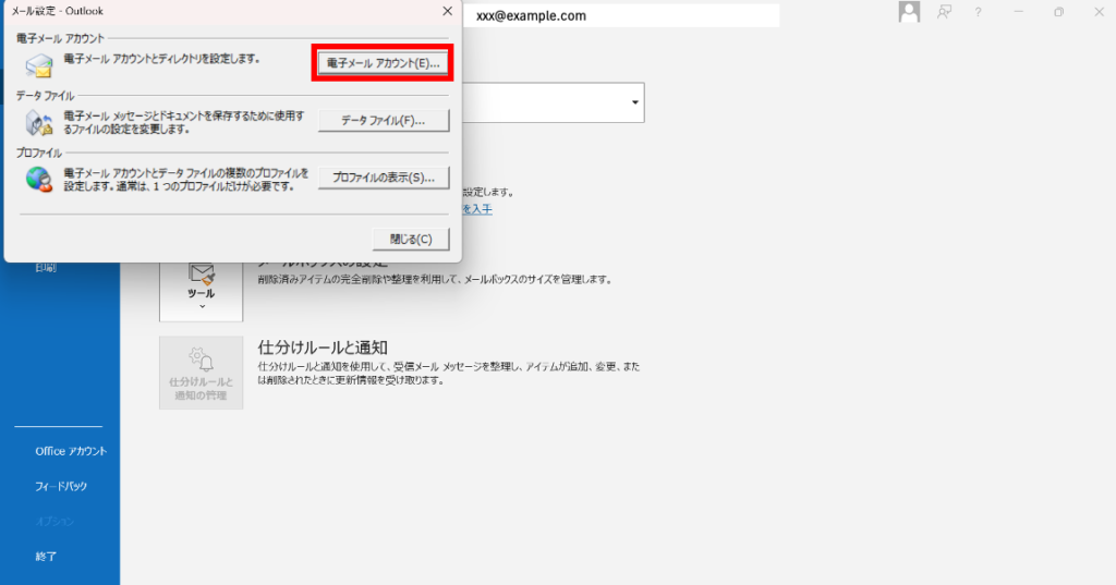 メール設定画面が表示されるので、そこから[電子メール アカウント]をクリックします。