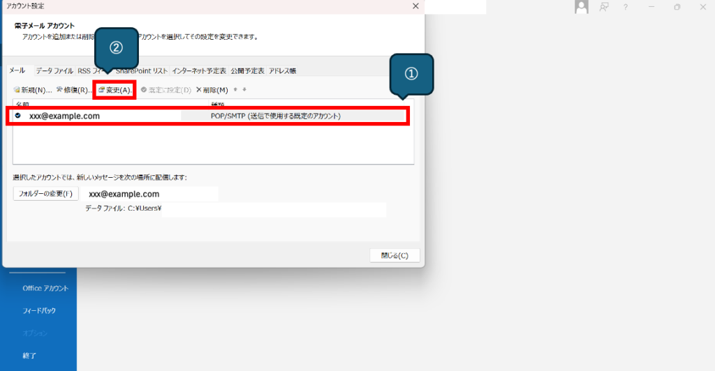 アカウント設定画面が表示されるので、そこから[①設定を変更するアカウント]を選択して、[②変更]をクリックします。