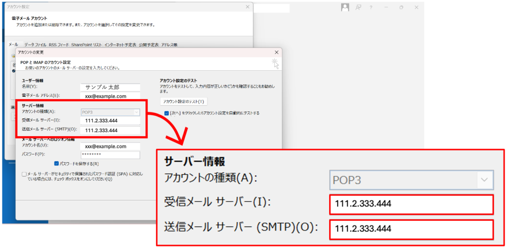 [受信メールサーバー]と[送信メールサーバー(SMTP)]には、「pop.example.com」や「smtp.example.com」といったメールサーバーを示すホスト名が設定されていることが多いかと思いますが、それを、ホスト名が示すIPアドレスに変更しておきます。