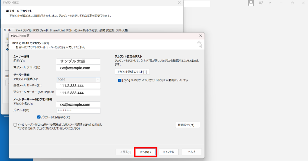 [サーバー情報]を変更したら[次へ]をクリックします。