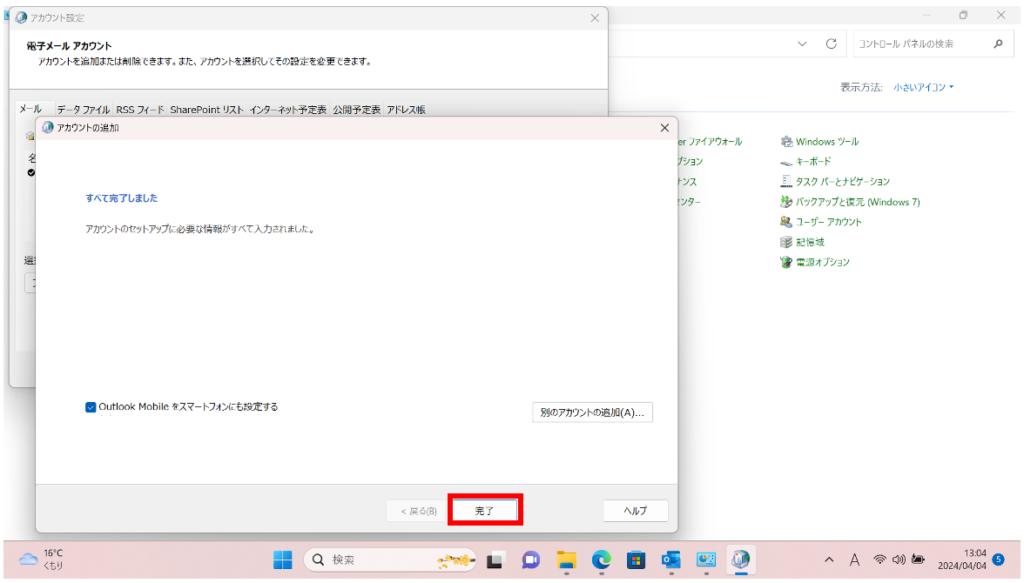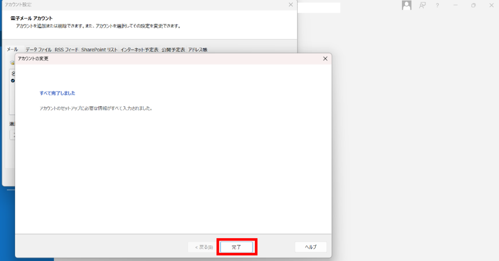 [アカウントの追加]画面が表示されます。[完了]をクリックして完了です。