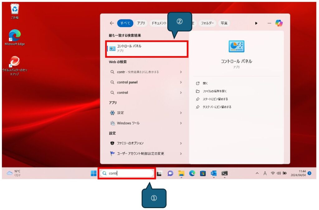 ホーム画面下部に①「contr」と入力し、②[コントロールパネル]を起動します。