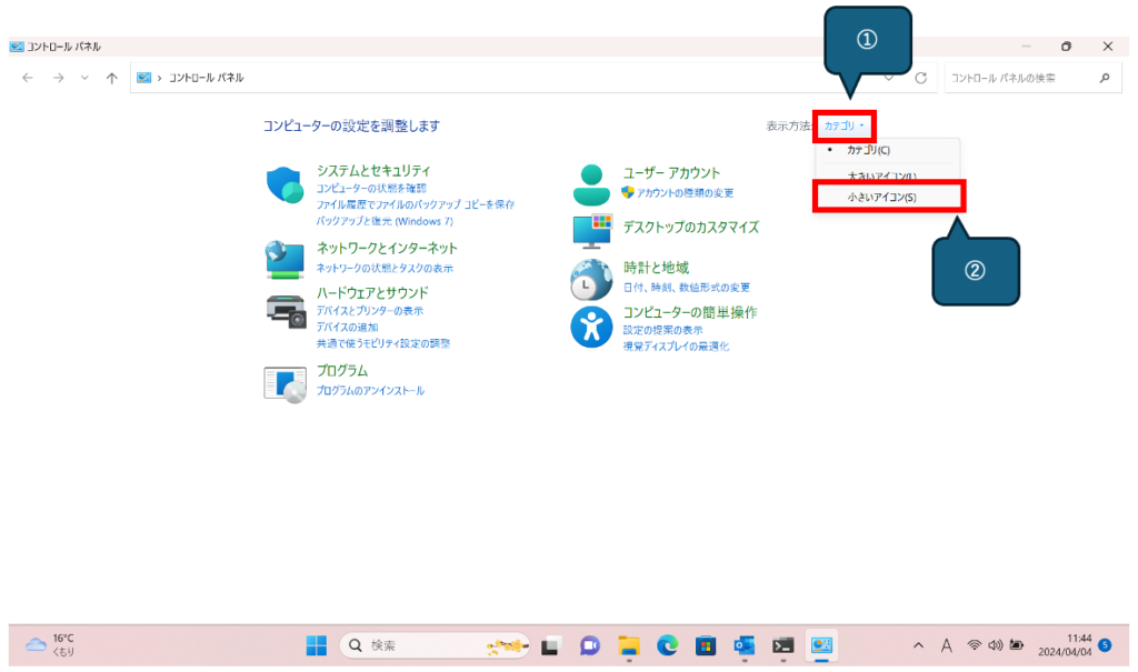 [コントロールパネル]が表示されるので、①[カテゴリ]をクリックして②[小さいアイコン]を選択します。