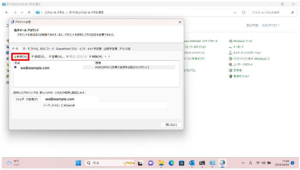 アカウント設定画面が表示されるので、そこから[新規]をクリックします。
