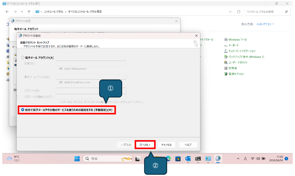 アカウントの追加画面が表示されるので、①[自分で電子メールやその他のサービスを使うための設定をする(手動設定)]を選択し、②[次へ]をクリックします。