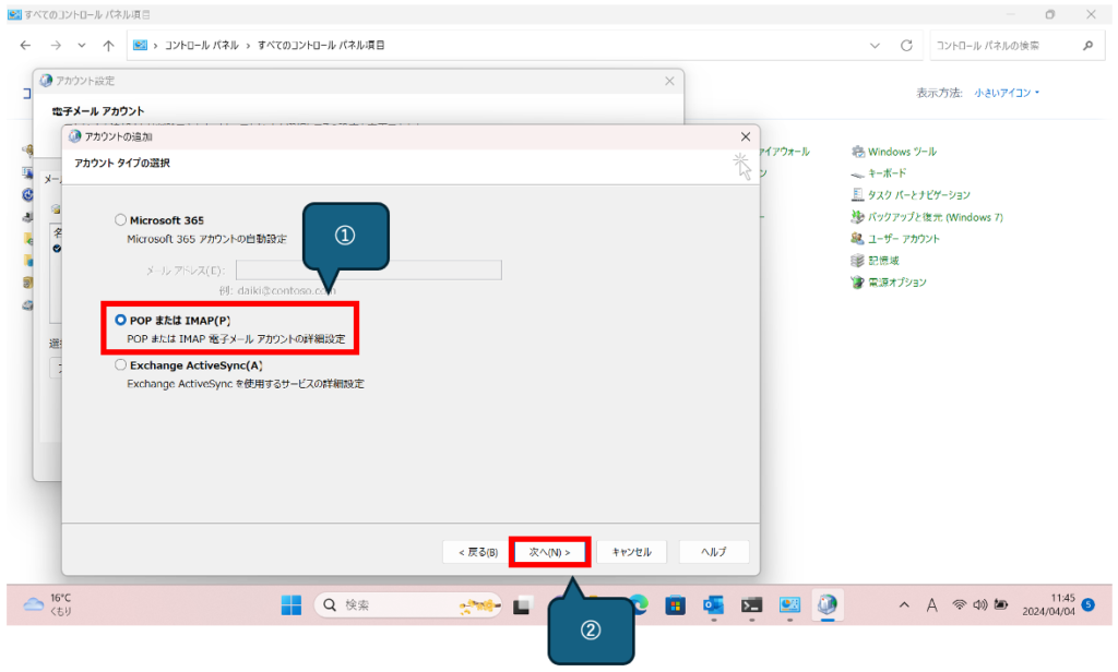 アカウントタイプ選択画面が表示されるので、①[POPまたはIMAP]を選択して②[次へ]をクリックします。