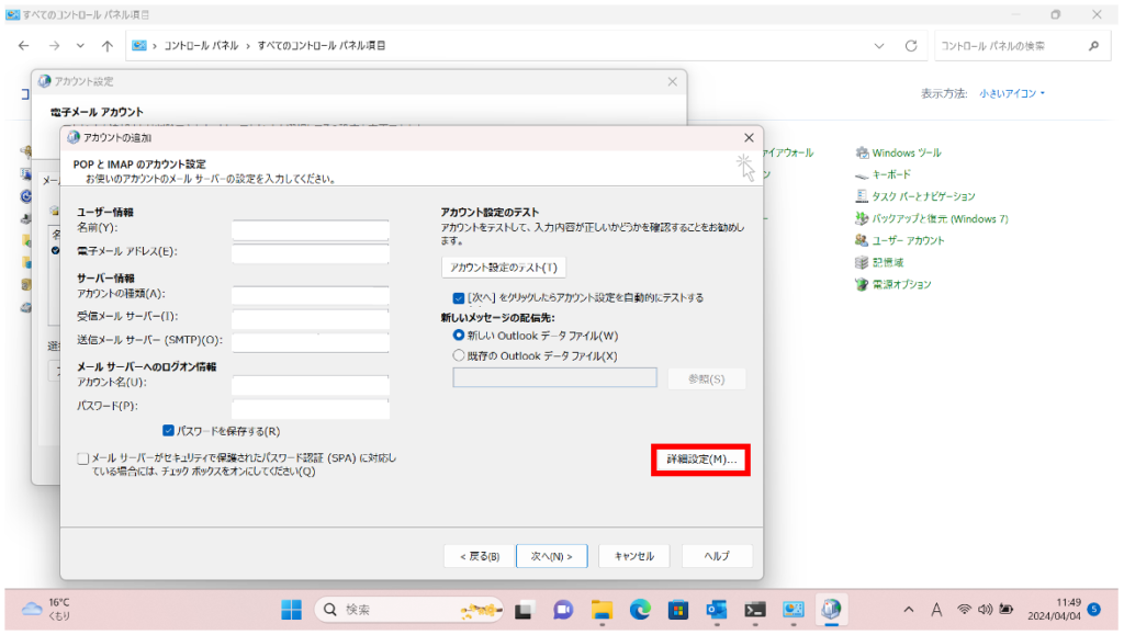 移転後のアカウント情報を入力したら[詳細設定]をクリックする。
