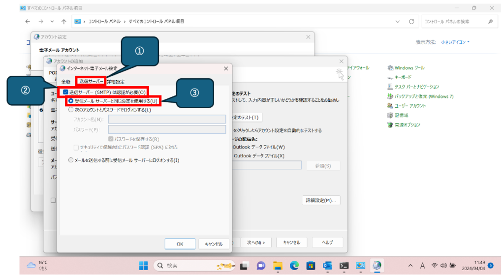 [インターネット電子メール設定]画面が表示されるので、①[送信サーバー]をクリックして ②[送信サーバー(SMTP)は認証が必要]をチェックし、③[受信メールサーバーと同じ設定を使用する]を選択します。