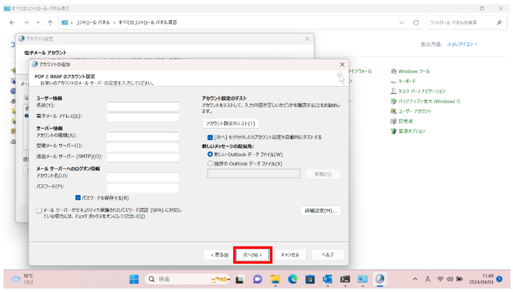 アカウント設定画面に戻るので[次へ]をクリック。