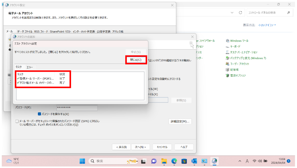 [テスト アカウント設定]画面が表示され、設定したアカウント宛にテストメールが送信されます。 問題なくテストメールが送信された場合[状況]に[完了]と表示されます。 [完了]と表示されたら[閉じる]をクリック。
