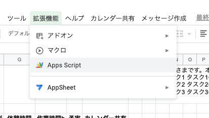 Google Apps Scriptのコードはスプレッドシートの拡張機能から追加できます。