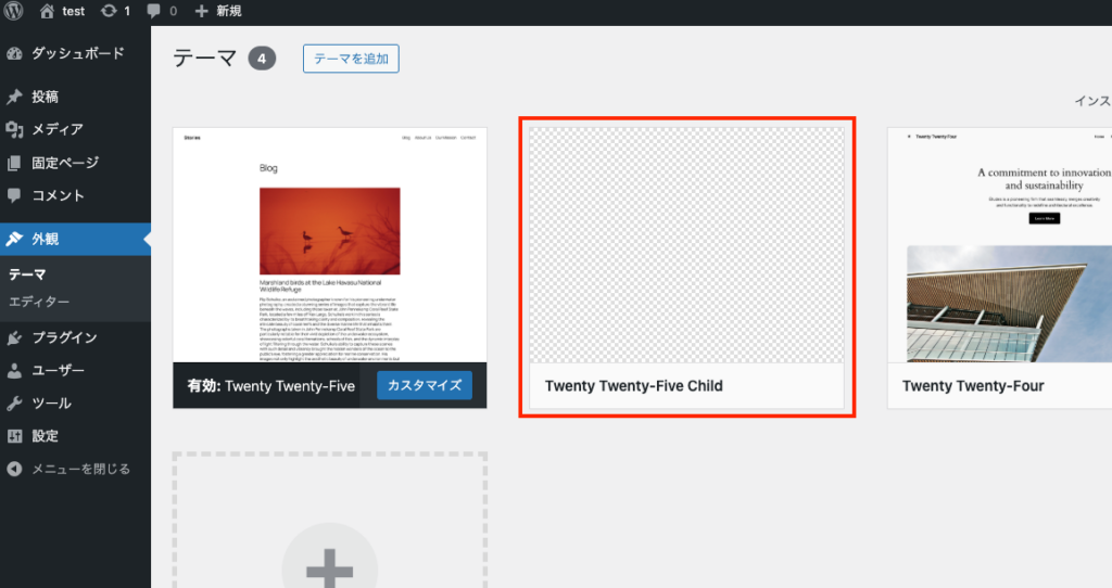 その後、WordPressダッシュボードより外観 → テーマ画面を開くと、作成した子テーマが表示されています。