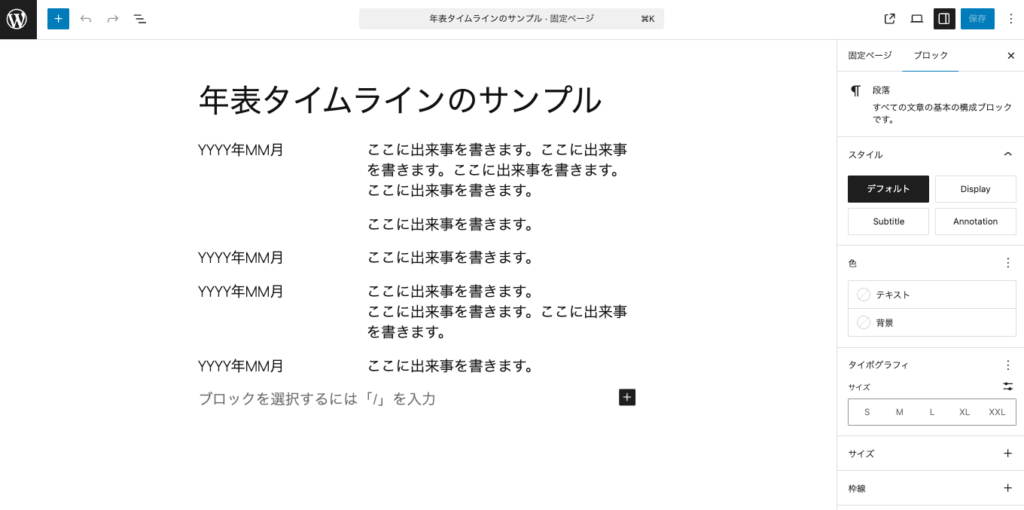 まずは年表タイムラインのフォーマットをブロックエディタで作ります。