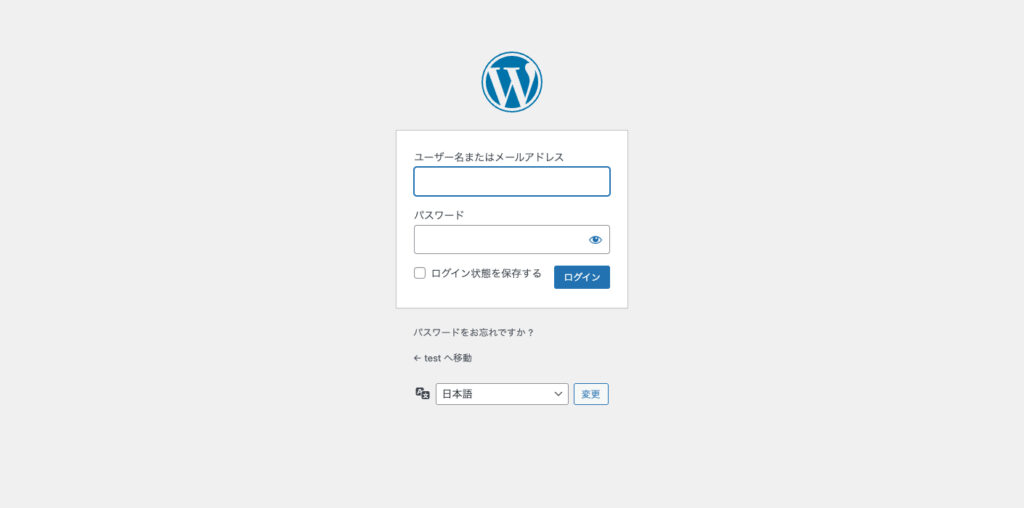 通常のログイン画面は、グレーの背景にWordPressのロゴとログインフォームが表示されています。