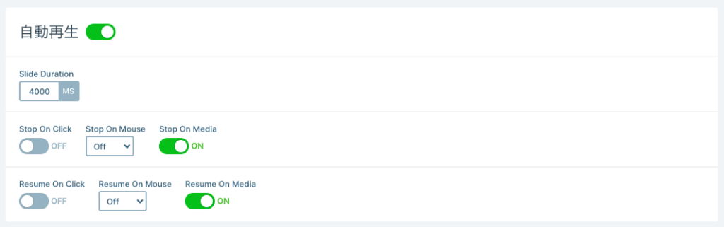 自動再生の設定値が表示されるので編集します(サンプルではSlide durationとStop on clickを変更し、他すべては初期値のままとしています。)