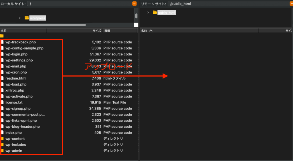 FTPクライアントソフトを使いWebサーバーへ接続し、「public_html」ディレクトリへ先ほど解凍したWordPressを構成するすべてのファイルをアップロードします。