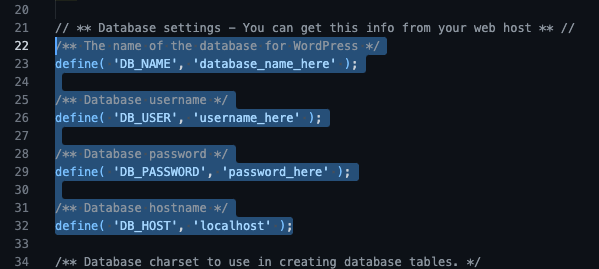 「wp-config.php」に記載されている次の行を自身のデータベース情報に修正します。