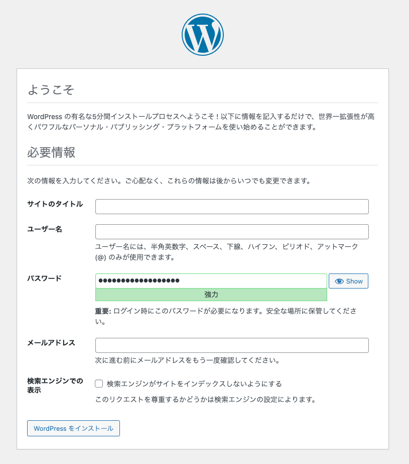 WordPressのインストール画面が表示されるので各項目を入力して「WordPressをインストール」ボタンをクリックします。