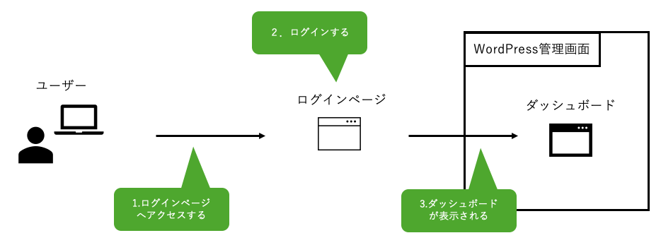 末尾のwp_adminはWordPress管理画面のダッシュボードを指しており、未ログインの場合はwp-login.phpへ転送されてログインページが表示されます。