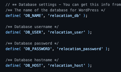 WordPress構成ファイルの「wp-config.php」を修正して移転先サーバーのデータベースに接続するように設定します。