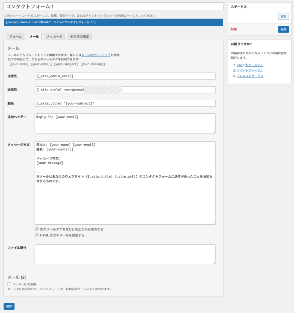 宛先メールアドレスはデフォルトでWordPressの「管理者メールアドレス」になっています。