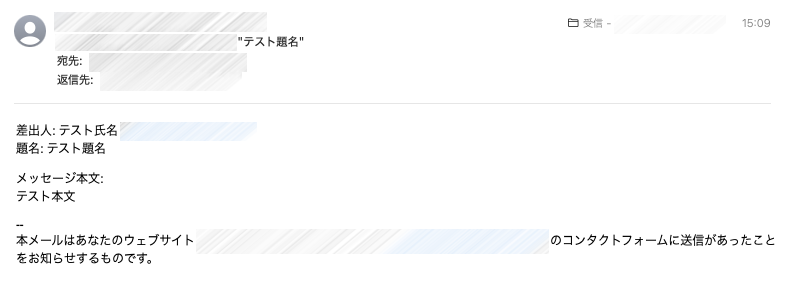 お問い合わせフォームの項目を入力して送信すると、次のようなメールがWordPressの「管理者メールアドレス」へ届きます。