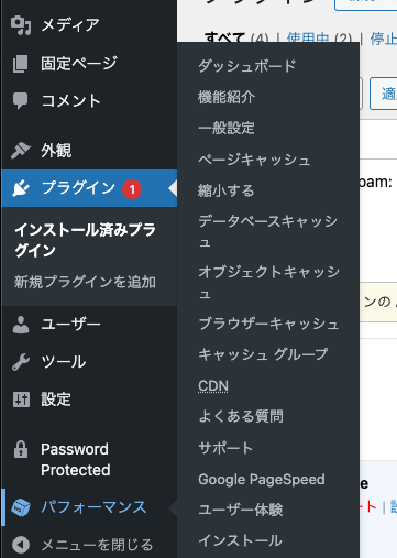 W3 Total Cacheを有効化するとWordPress管理画面の左側に「パフォーマンス」の項目が追加されます。