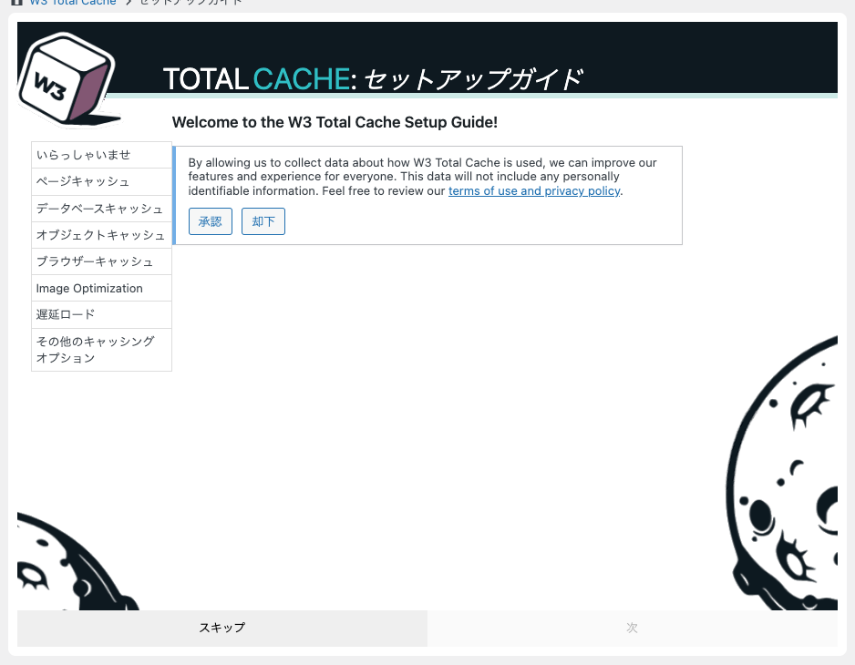 W3 Total Cacheをはじめてインストールしたときはセットアップガイドが表示されます。