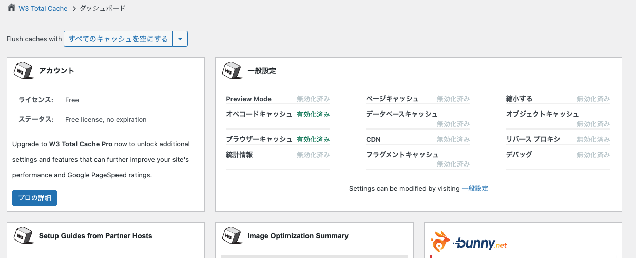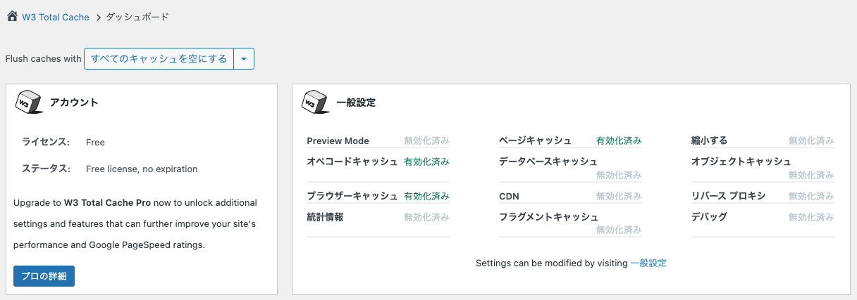 W3 Total Cacheのダッシュボードを再び表示すると「一般設定」の「ページキャッシュ」が「有効化済み」となっています。