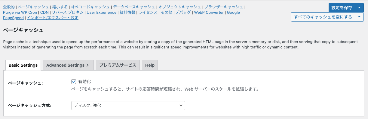「ページキャッシュ」の有効化をチェックして、画面右上の「設定を保存」をクリックします。