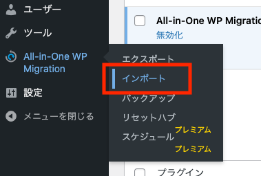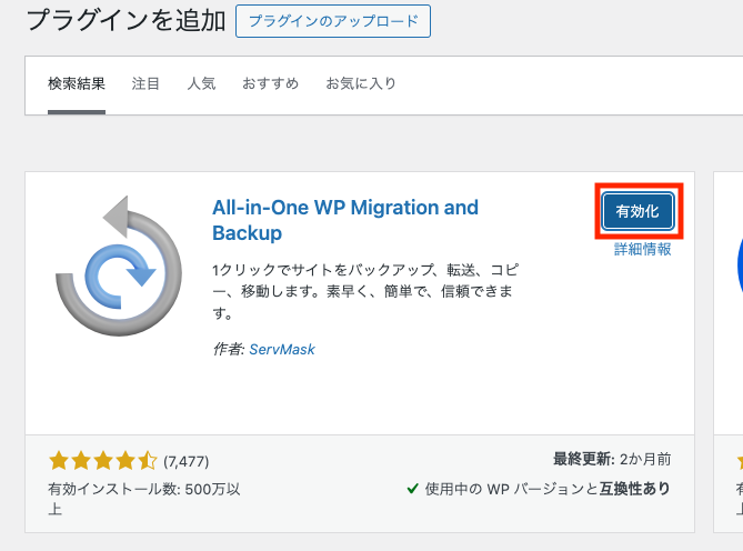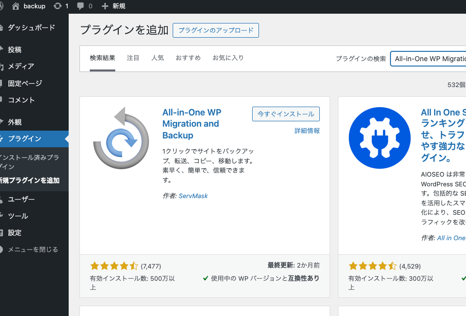 先にご紹介した手順と同じように、プラグインの追加画面からAll-in-One WP Migrationをインストールします。