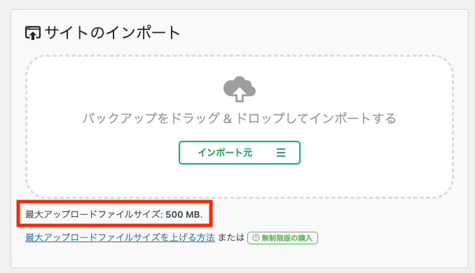 インポートするファイルが500MBを超える場合はphp.iniを修正して最大アップロードファイルサイズの上限を引き上げます。