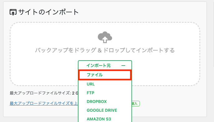 インポートするファイルを選択するウィンドウが表示されるの、先程エクスポートした.wpressファイルを指定します。