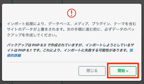 インポートが完了すると最終確認画面が表示されるので「開始」をクリックします。