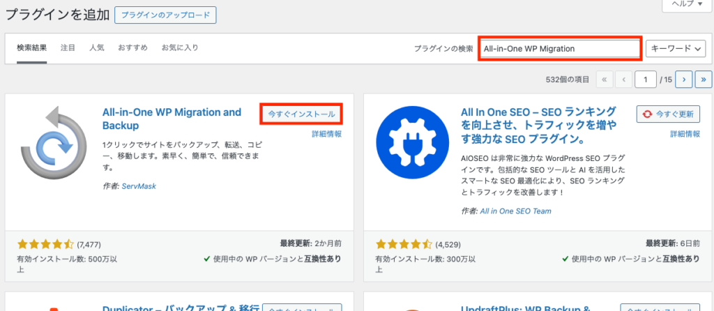 「All-in-One WP Migration」と検索してその結果から「今すぐインストール」をクリックします。
