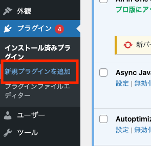 WordPress管理画面よりプラグインの新規追加画面を開きます。