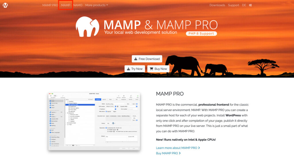 サイトにアクセスしたらヘッダーメニューからMAMPをクリックします。