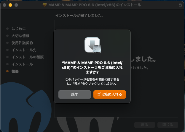 インストーラーの削除です。不要であれば、ゴミ箱に入れるをクリックすると削除してくれます。