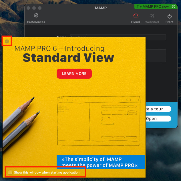 まずはMAMPを起動するのですが、そうすると広告が表示されます。