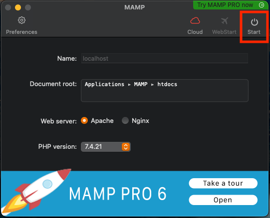 MAMPのウィンドウ右上にあるStartをクリックします。
