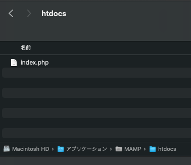 ルートディレクトリは「/Applications/MAMP/htdocs/」がデフォルト設定されているので、そこにphpinfo()するindex.phpを置きます。