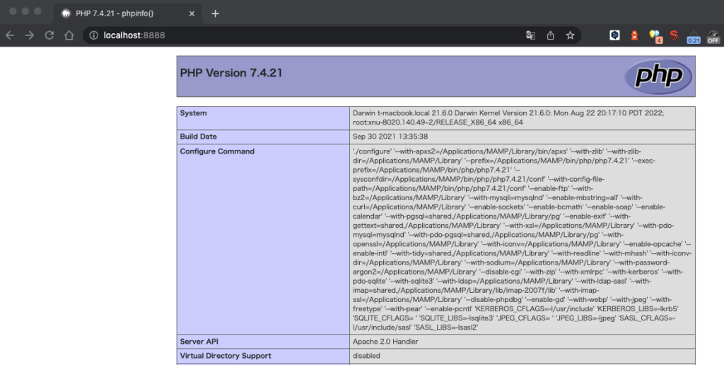 再度ブラウザでhttp://localhost:8888/にアクセスしてみるとPHPの情報が表示され、そのバージョンもMAMPウィンドウで設定した通りになっていると思います。